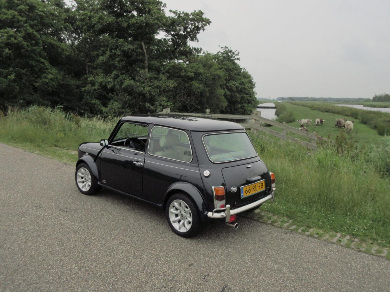 Deze Rover Mini werd in 1999 nieuw geleverd in Duitsland. Daar kreeg hij een smakelijk pretpakket aangemeten. Dat bestond uit de spatbord verbreders en dikke 13″ wielen met lichtmetaal, voorzieningen die deze Mini een massief en stoer karakter geven. Verder vond een viertal verstralers een plekje tussen de karakteristieke koplampen, en deze Britse classic werd verder met chroomaccenten verfraaid.