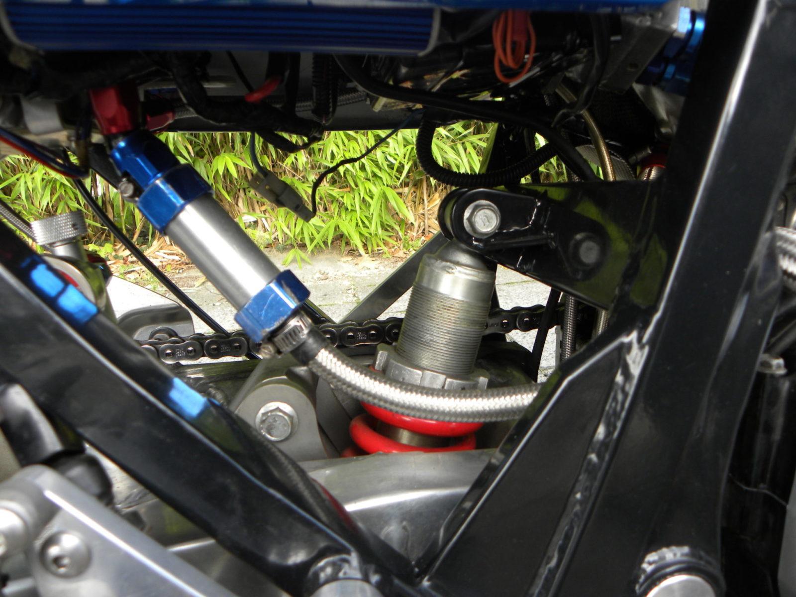 Intussen hadden allerlei snelheidsfreaks ontdekt dat de lucht/olie gekoelde Suzuki viercilinders (SACS Suzuki Advanced Cooling System) een bijna eindeloze potentie hadden om getuned te worden. De motorblokken werden op allerlei manieren ingezet om ergens het sterkst en snelst te zijn. En zo moet ook Gert-Jan Geurts geïnspireerd zijn geraakt. En met de bijna eindeloze wielbasis zit er niet erg veel nerveuzigheid in het stuurgedrag