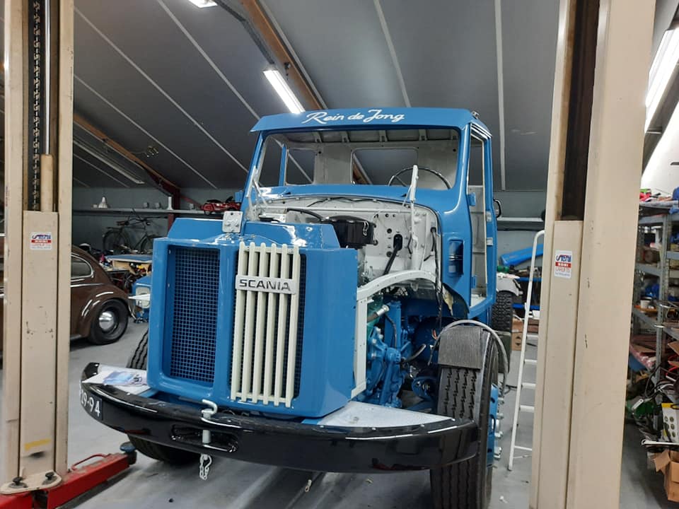 Hij wist een aardige indicatie van de locatie. Hij kroop achter zijn toetsenbord en klikte op Google Earth. Die satellietfoto’s zijn niet erg actueel. Maar de Scania L80 stond al een poosje buiten. In een paardenbak. Ergens in de buurt van de Apenheul. Hij was te zien op de satellietfoto’s. Toen werd het makkelijk. Er groeide een boom dwars door het chassis. Het plaatwerk – deze L80 was er een van de eersten met een Stalen fabriekscabine – was er verschrikkelijk aan toe. De Scania kreeg wind in de banden en werd lopend – en remmend – gemaakt. Het blok was intern brandschoon en prima in orde. De historie van de Scania was intussen ook helemaal bekend en dat maakte het verhaal alleen maar leuker. De Scania hoorde tot de vloot van Rein de Jong, en dat was indertijd een heel grote speler met wel 100 trucks. Jelle besloot de ‘neus’ in zijn oude glorie te herstellen.
