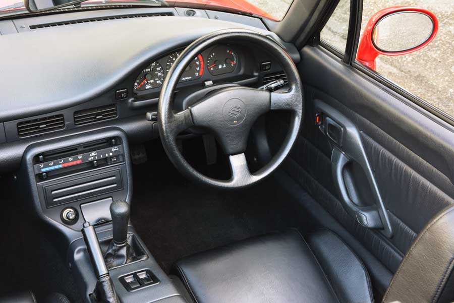 Geen allemansvriend, de piepkleine Suzuki Cappuccino. Maar wie erin past wacht een belevenis die zijn weerga niet kent. Dat begint al met de superstrak schakelende vijfbak en vooral het heerlijk jengelende turbomotortje, dat bizar snel in toeren klimt en pas bij 8000 tpm aan de voet van de rode zone staat. Voor je gevoel gaat het buitenaards hard. Want je scheert met je billen rakelings over het asfalt, waarbij je ribbenkast geen richeltje mist. Over kont gesproken: die breekt subiet uit zodra je het halverwege waagt om ook maar naar het gaspedaal te kijken, zelfs op kurkdroog wegdek. Deze Soes biedt met zijn even uitgewogen als vermakelijke weggedrag de hoogst denkbare pretgarantie en houdt je tegelijkertijd altijd bij de les, alsof je net een espresso in één teug hebt weggeslikt.