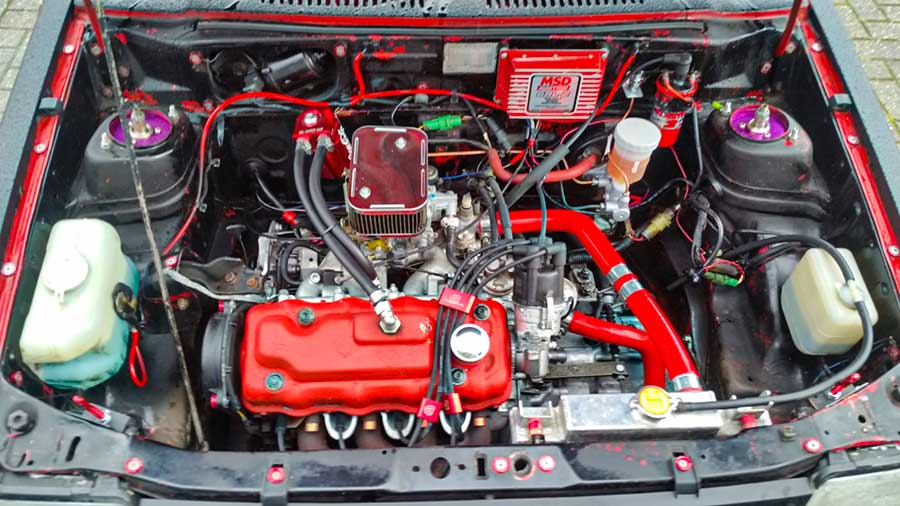 Rik: ”Ik heb de motor ‘opgekieteld’ van 60 naar 87 pk, 2 traps Webers gemonteerd, het dak vervangen door een lichter carbon exemplaar en de ramen uitgevoerd in lexaan. Dit allemaal om de auto lichter te krijgen om op het circuit maximaal te kunnen profiteren.” Er zijn dan ook plannen om na de virus misère mee te doen met classic races in Assen en op het Belgische zolder in de hobbyklasse.