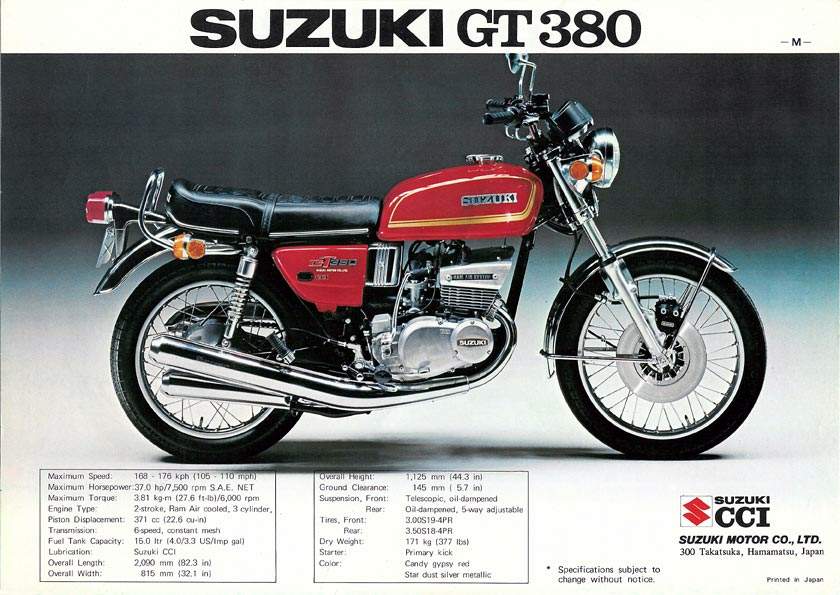 De smering van de GT werd trouwens verzorgd door Suzuki’s herziene aparte oliesysteem, dat vanaf dat moment ‘CCI’ heette. Nog iets uit de natte hoek: de Suzuki GT380 had een vacuüm bediende benzinekraan. Daaronder zaten drie Mikuni VS24SC carburateurs. Een Suzuki GT380 was niet erg sterk (krap 40 pk), niet erg snel (160 km/h) en was geen lichtgewicht (leeg 171 kg). Maar de zesversnellings GT380’s met hun versnellingsindicatoren waren degelijke, mooi afgewerkte motorfietsen en Suzuki had de reputatie van een mensvriendelijke prijsstelling. De krachtbron was niet nerveus en aan boord was er serieus ruimte voor twee personen. Maar bij heel dapper rijden werden ze wat onstabiel. Het feit dat de voetsteunen star waren gemonteerd (en het uitlaatsysteem) maakten dat de grondspeling in snelle bochten zijn grenzen had.
