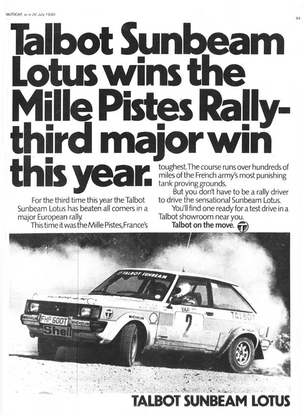 In Groot-Brittannië experimenteerde men intussen direct al met een door het Competition Centre geprepareerde Lotus-versie van de Sunbeam-hatchback voor deelname aan de internationale rallysport. Dess O’Dell, de competitiechef van Chrysler, was al jaren bezig om een succesvol rallywapen te maken. maar dat wilde maar niet lukken. Met de komst van de Sunbeam hatchback zag O’Dell z’n kansen op succes groeien en een nieuwe Groep 2-auto te ontwikkelen.