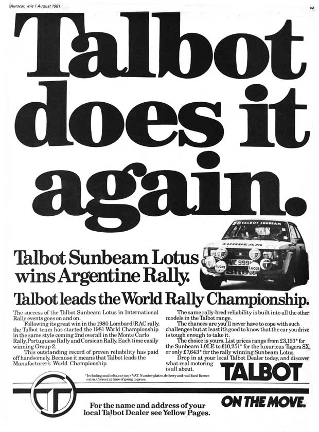 Zo’n bulderboxje liep bijna 200 km/u en dat zouden de inzittenden weten ook. Het motorgeluid in het interieur was fenomenaal. En de brute manier waarop de vrij hoekige koets door de rijwind heen wrikte was ook een garantie voor een hoop lawaai. De vijfbak schakelde wat vaag, maar dat was een kwestie van wennen. Rijtechnisch gedroeg de Talbot Sunbeam Lotus zich als een skelter op een gravelbaan. Gelukkig zaten de bestuurder en bijrijder stevig in hooggerugde kuipstoelen. En dat het van de Avenger afgeleide onderstel het knap moeilijk had met al dat Lotus geweld? Dan had hij maar door moeten leren!