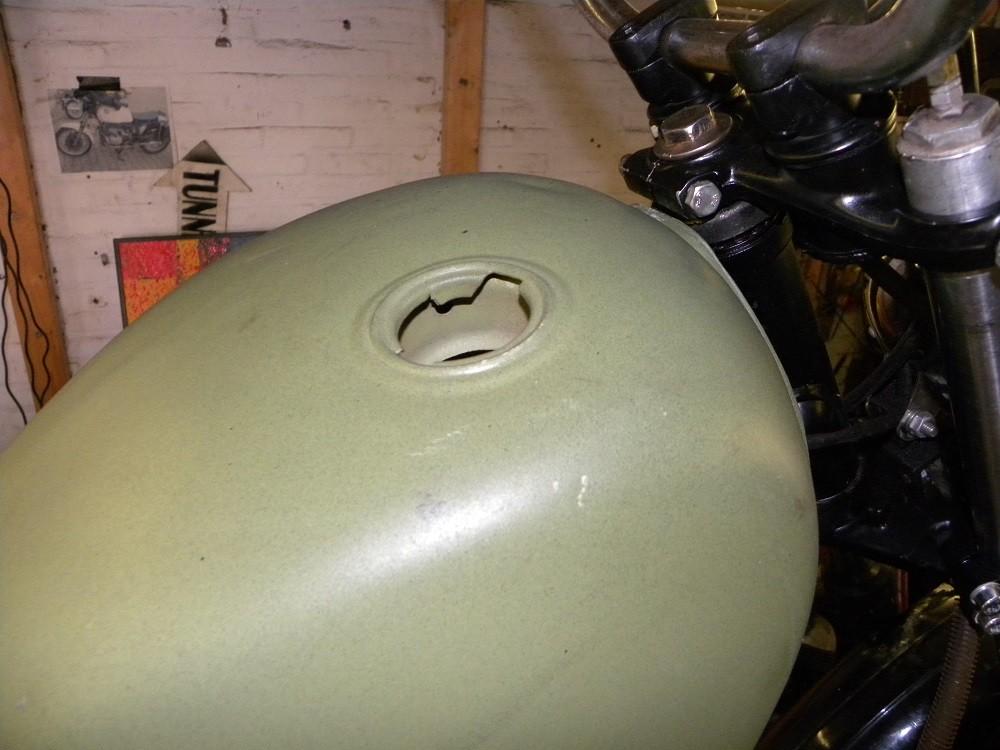 En wat voor tankdop hoort er op? Die vraag wordt gesteld omdat het blijkbaar geen Guzzitank is. Dat is niet echt nodig ook, want hij komt op een machine die hoogstens in schijn erg klassiek, en zeker niet raszuiver is: Een eerbetoon op budgetbasis aan de Britse twins met star achterframe van omstreeks WOII.