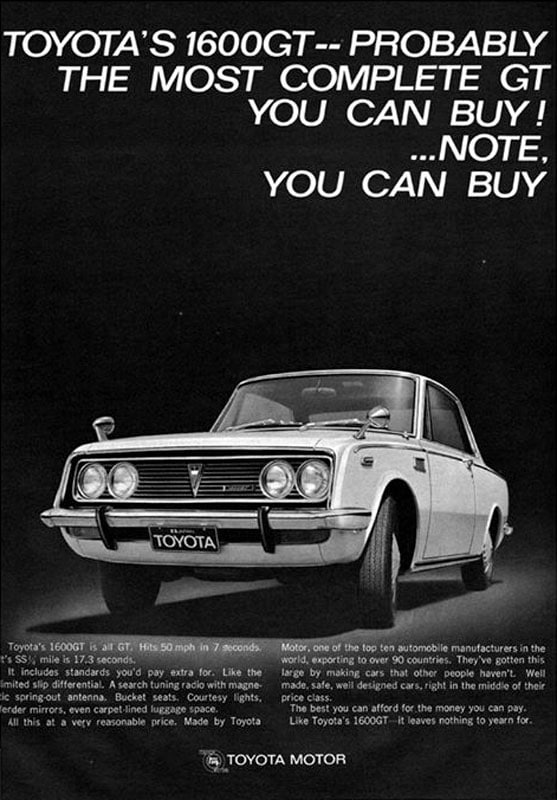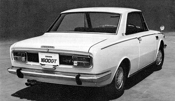 De Toyota 1600 GT was een zorgvuldig geconstrueerd antwoord op vaderlandse sportievelingen. Deze zagen dankzij de groeiende populariteit van op sedanversies gebaseerde sportmodellen het levenslicht. Zo had Japan kennisgemaakt met de Isuzu Bellett 1600 GT, de Prince Skyline 2000 GT, de Hino Contessa 1300 Coupé en de Datsun Bluebird SSS. Deze sportieve gezinswagens waren al een paar jaar op de markt, maar Toyota zette daar in 1967 dus een ijzersterk wapen tegenover.