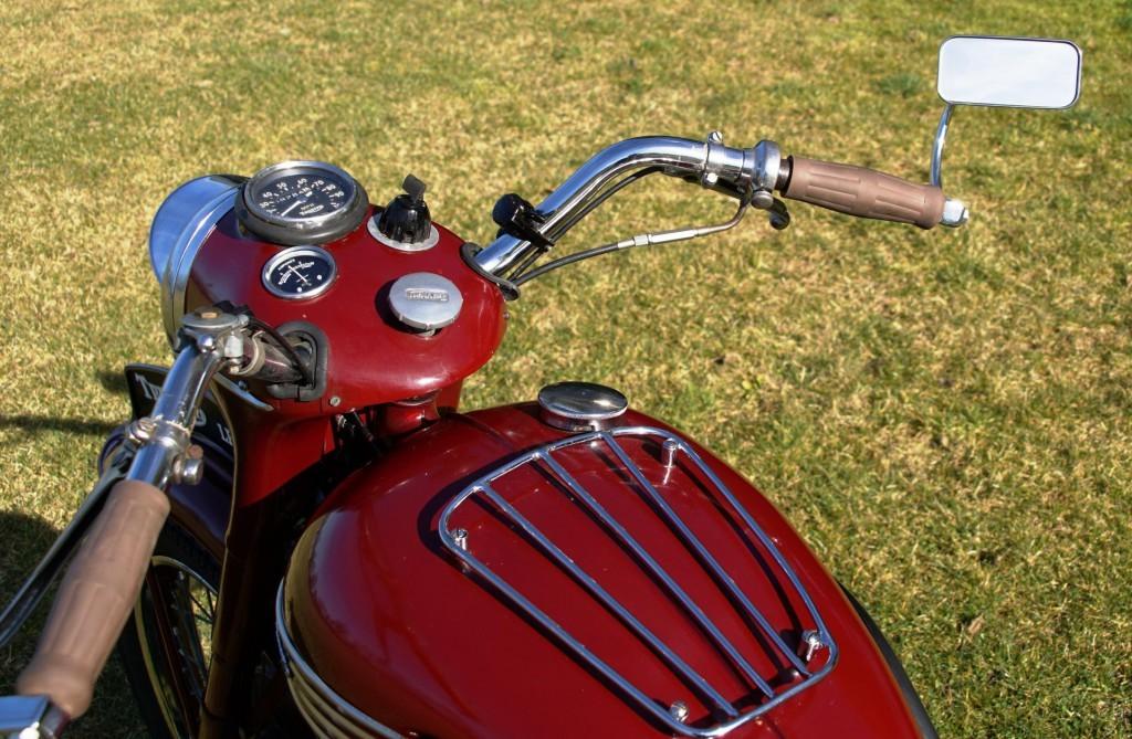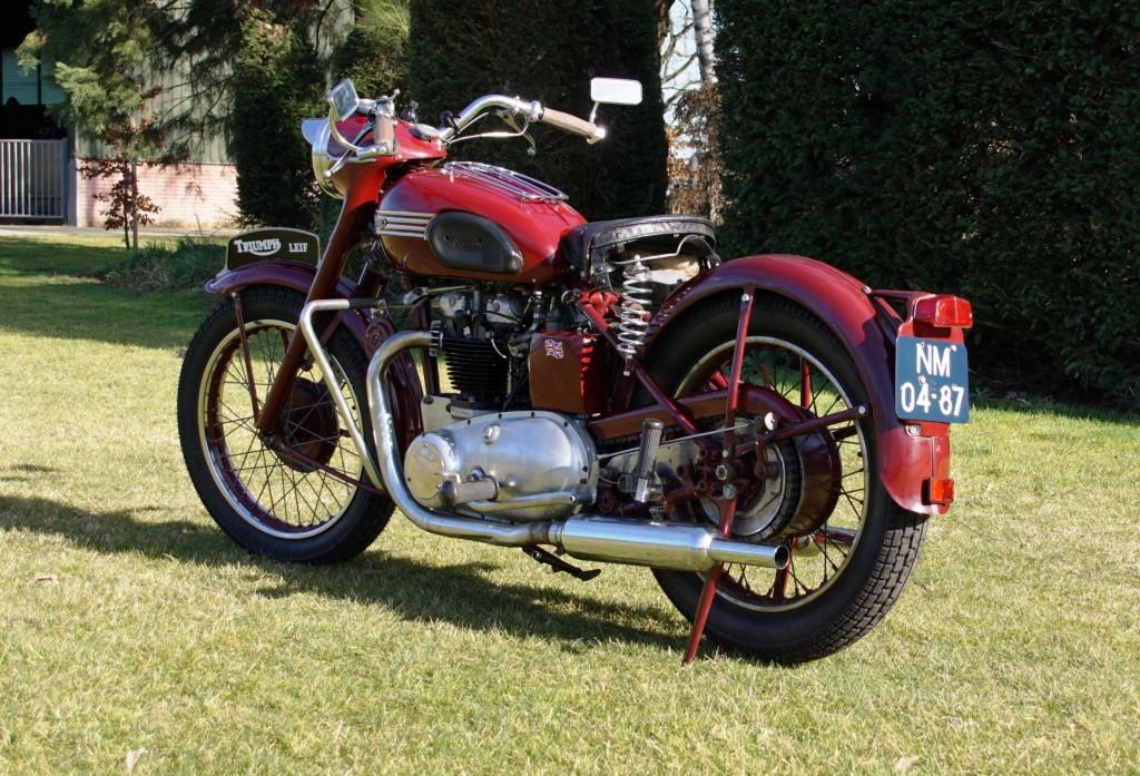 In 1938 schiep Edward Turner samen met Bert Hopwood de legendarische 5T ‘Speed Twin’. Boring en slag van de 500 cc Speed Twins waren gelijk aan de oudere 250 cc eencilinders. En zo werd 2x 250 cc… 500 cc. Simpel! De 5T bleek erg succesvol en werd de basis voor alle Triumph-blokken tot in de jaren tachtig. Het eerste model leverde 26 pk, woog 165 kg en liep sneller dan 140 km/h. In 1938 verscheen de eerste Triumph die ’the ton’ (100 mijl per uur) kon halen, de 500 cc Tiger T100. En aan het begin van de jaren vijftig was een 500 tweecilinder nog steeds een zware motorfiets. De motor op de foto’s heeft zelfs al achtervering. Dat was dan wel de ‘Sprung Hub’, de ‘geveerde naaf’ die weinig veerde en absoluut dodelijk zijn veren lanceerde bij onvoorzichtige montage, maar toch: hij veerde.