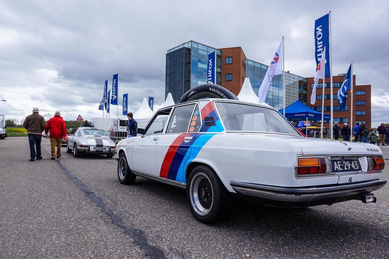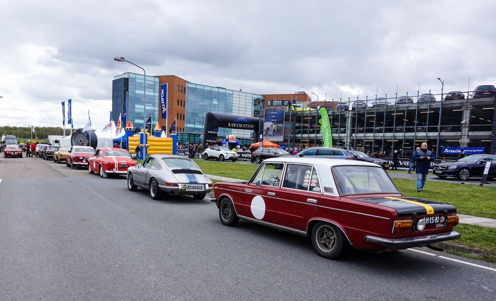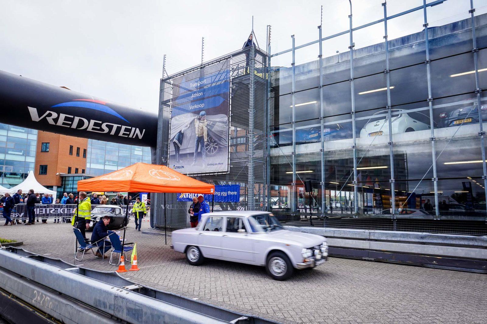 Normaal gesproken is de technische keuring voor een rally een beetje saai: papierwerk, kijken of alle lampen van de auto het doen, dat soort dingen. De organisatie van de Tulpenrallye had er dit keer meer werk van gemaakt. Op het terrein van Athlon (een leasemaatschappij die zichzelf ‘mobiliteitsprovider’ noemt) werden namelijk niet alleen de ruim 200 deelnemende auto’s gekeurd; de klassiekers namen het ook tegen elkaar op in een sprint.