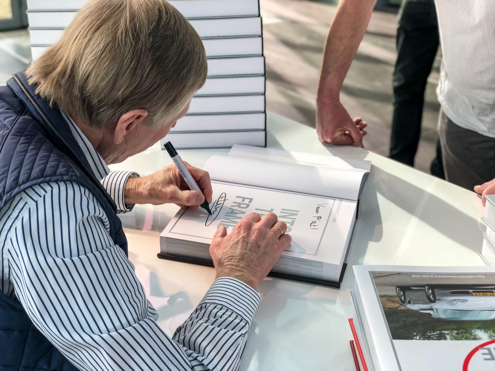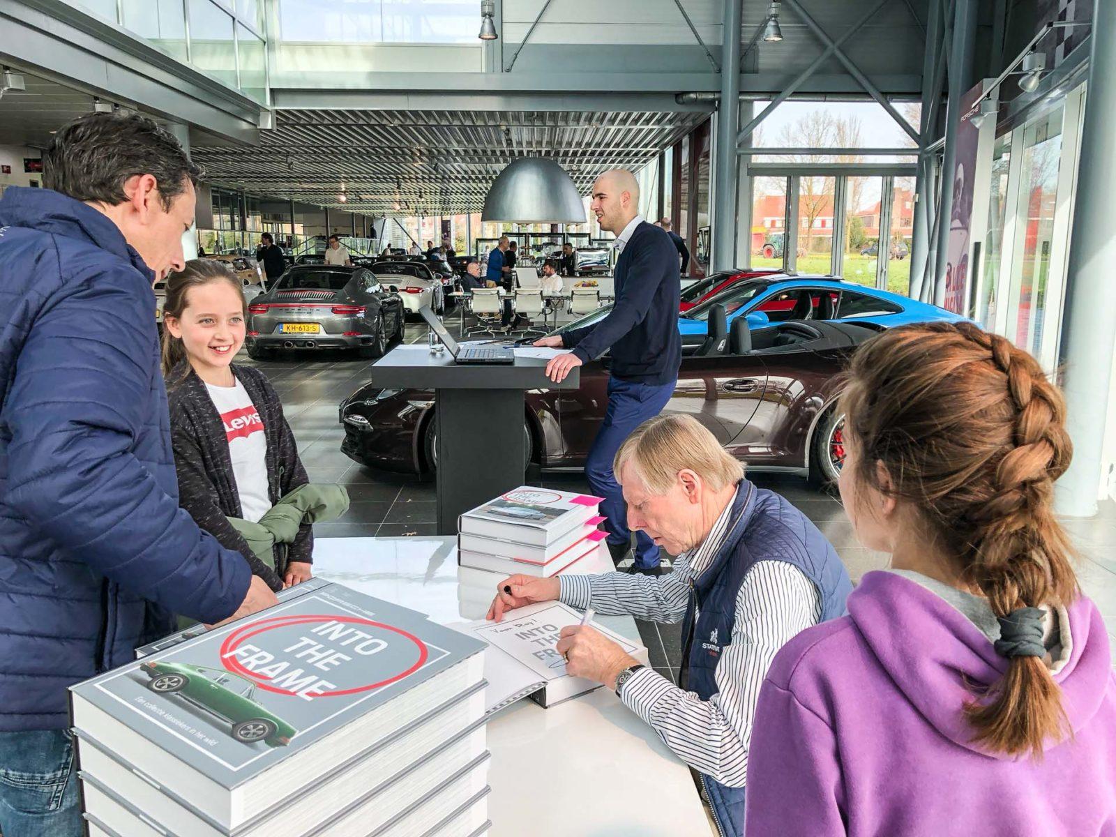 Natuurlijk zijn de auto’s van eigenaren die dat niet wilden niet in het Porsche boek opgenomen, maar voor de eigenaren die dat wél wilden is er nu iets bijzonders te verkrijgen bij de Porsche-dealer: een Porsche boek met je eigen auto erin. Met een bijzonder tintje: de stofomslag is gepersonaliseerd, zodat iedere deelnemer zijn eigen Porsche op de cover kan vinden. Bij Porsche Centrum Leusden kregen de deelnemers hun boek gesigneerd en wel overhandigd door Gijs van Lennep. Niet voor niets, want Van Lennep vertelt in het Porsche boek ook iets over de 911 RSR.