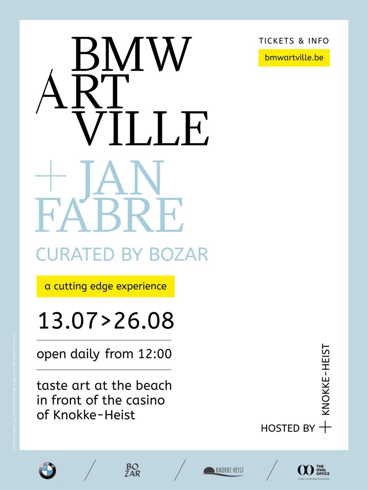 De gemeente Knokke-Heist en BMW creëren vanaf deze zomer een nieuwe exclusieve locatie op het strand, pal voor het casino: BMW ARTVILLE. Dit ambitieuze meerjarenproject biedt een unieke mix van kunst, technologie en lifestyle. Deze eerste editie opent met JAN FABRE CURATED BY BOZAR, een kunstbeleving bestaande uit verschillende creaties van beeldend kunstenaar, theaterkunstenaar en auteur Jan Fabre. Daarnaast zullen de bezoekers de exclusieve BMW ART CARS van en Alexander Calder en Andy Warhol kunnen bewonderen.