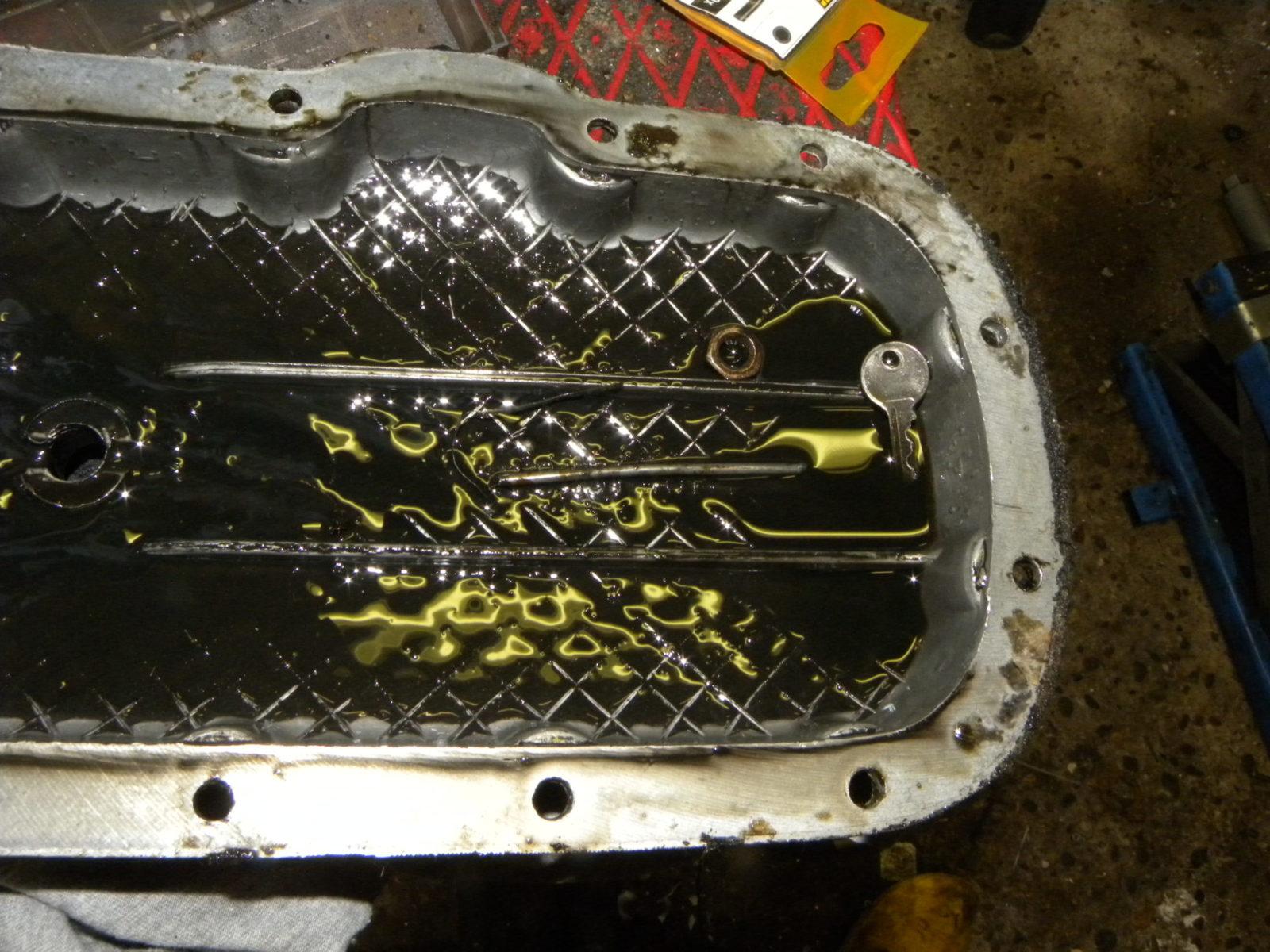 Al het gesleutel begon met het vervangen van de cilinders en zuigers. De zaak daar in het vettige duister was mis gegaan omdat de zuigers ‘verkeerd om‘ en de zuigerveren op de gok waren gemonteerd. Met nieuwe, Poolse cilinders van aluminium moest de zaak aanzienlijk koeler gaan lopen. In de oude carterpan vond ik een M8 moer met fijne draad, een sleuteltje en een stuk draad zoals het afgebroken eind van een popnagel. De moer is er eentje zoals op de tapeinden van de carburateur bevestiging. Het stuk popnagel zal gewoon eens verdwaald zijn. Maar dat sleuteltje?