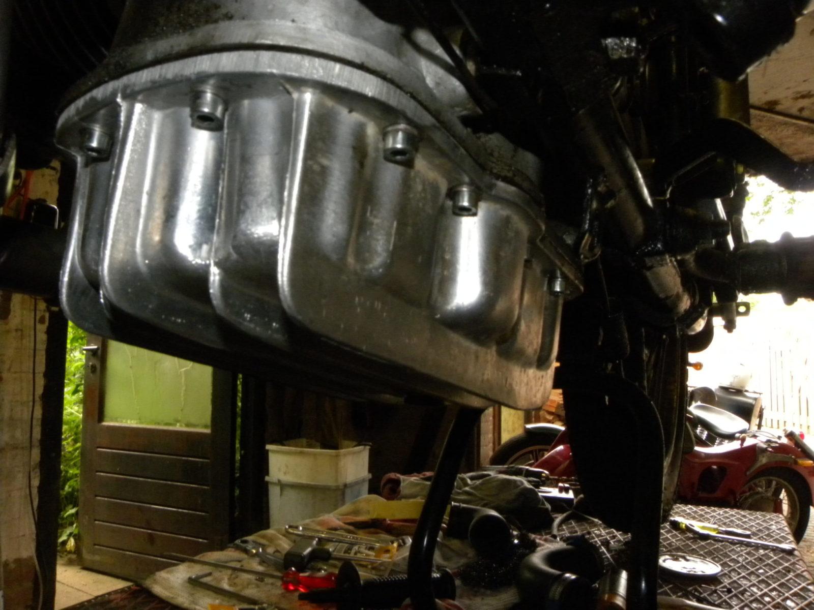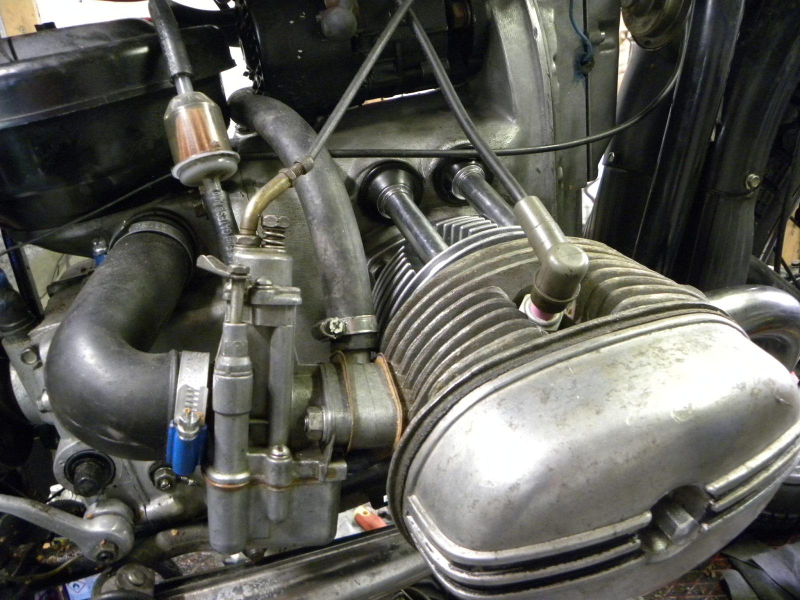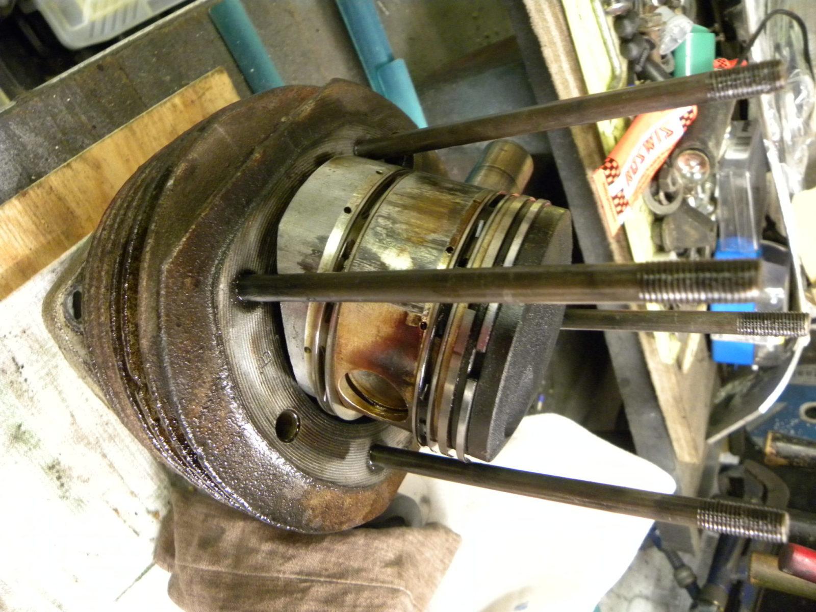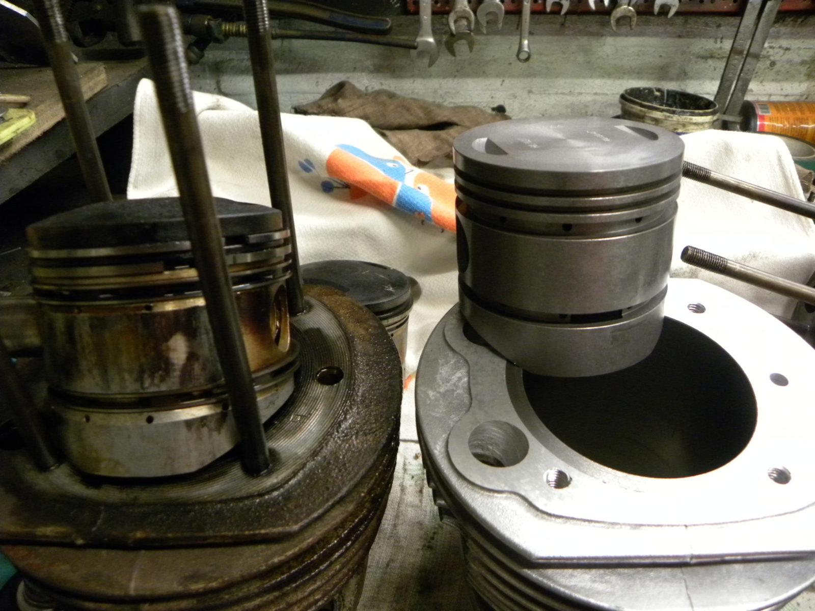 Al het gesleutel begon met het vervangen van de cilinders en zuigers. De zaak daar in het vettige duister was mis gegaan omdat de zuigers ‘verkeerd om‘ en de zuigerveren op de gok waren gemonteerd. Met nieuwe, Poolse cilinders van aluminium moest de zaak aanzienlijk koeler gaan lopen. In de oude carterpan vond ik een M8 moer met fijne draad, een sleuteltje en een stuk draad zoals het afgebroken eind van een popnagel. De moer is er eentje zoals op de tapeinden van de carburateur bevestiging. Het stuk popnagel zal gewoon eens verdwaald zijn. Maar dat sleuteltje?