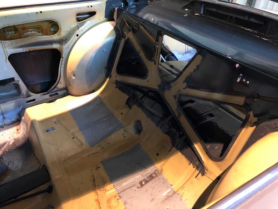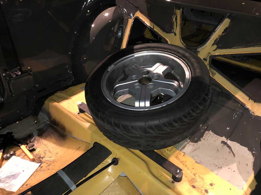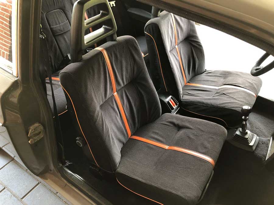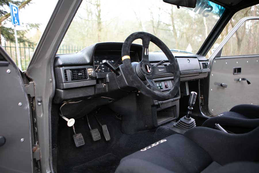 En kijk eens. Van verre afstand is de rolkooi te zien. Hij zit erin voor de sier. Hij vult de leegte op van de achterbank die eruit is gehaald. Voor de twee inzittenden zijn er diepe kuipstoelen gemonteerd. Het deep-dish stuur en de Momo versnellingspook zijn echte blikvangers. En dan is er nog iets bijzonders. In de kofferbak ligt de aluminium benzinetank lastig midden in de opbergruimte. Geen grote boodschap die erin past dus.