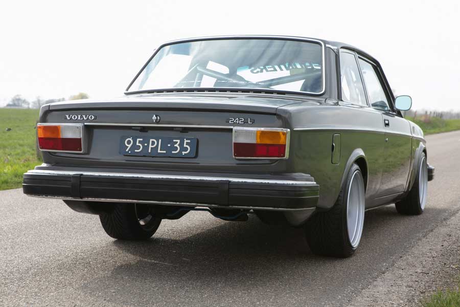 Meest opvallend zijn natuurlijk de diepe velgen en de brede laagprofielbanden. Ze zijn afkomstig van de Renault Vel Satis. En dan is er ook de stand van de Volvo 242 custom. Dat heeft iets agressiefs, iets snels. Hij staat laag en met het kontje ietsjes omhoog.