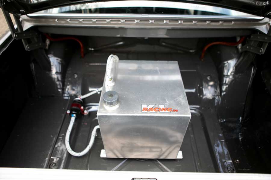 En kijk eens. Van verre afstand is de rolkooi te zien. Hij zit erin voor de sier. Hij vult de leegte op van de achterbank die eruit is gehaald. Voor de twee inzittenden zijn er diepe kuipstoelen gemonteerd. Het deep-dish stuur en de Momo versnellingspook zijn echte blikvangers. En dan is er nog iets bijzonders. In de kofferbak ligt de aluminium benzinetank lastig midden in de opbergruimte. Geen grote boodschap die erin past dus.