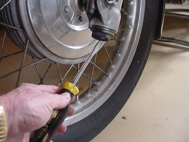 De olie uit de voorvorkpoten laten lopen is doorgaans geen probleem. Draai de dop boven op de binnenpoot (PAS OP! STAAT ONDER VEERSPANNING!) of het beluchtingsdopje boven op de dopmoer los. Draai de aftapbout die ergens onder aan de buitenpoot zit los nadat er een bakje onder is gezet. Dat hoeft geen emmer te zijn. Zoveel olie zit er ook weer niet in een stel vorkpoten. Er bestaat een vrij grote kans dat er geen straaltje olie,. maar alleen wat miezerige druppels uit de voorpoten komt. De vrije afloop kan belemmerd zijn door allerlei neergeslagen drab. Om de voorvork te verwijderen moet het voorwiel er uit. Dan moeten de vorkpoten er uit. Dat begint met de demonteren van het voorwiel. Ondersteun daarbij het carter zodat de voorwielloze motor niet naar voren kan kiepen. Het voorspatbord moet er ook af en leg dat voorzichtig opzij om beschadigingen te voorkomen. Los vervolgens de klembouten die de vorkpoten in de T-stukken omhelst houden. Daarna moeten de vorkpoten er met enige rustige nadruk uitgenomen kunnen worden