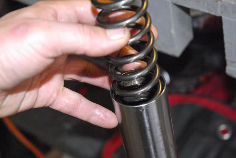 Verwijder de dop boven op de vorkpoot (PAS OP! STAAT ONDER VEERSPANNING!). De binnenpoot zakt nu omlaag, de veer steekt er boven uit en als het even tegen zit, dan is de eerste plas olie op de grond een feit.