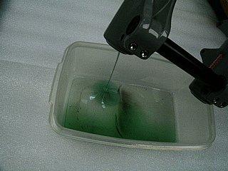 Pomp de binnen poot op en neer. Er komt nu waarschijnlijk meer olie uit de poot. Omkeren en leeg laten lopen kan ook. Spoel de poten daarna met wat dunne olie of diesel tot er geen smerigheid meer mee naar buiten komt. Laat ze een poosje uitdruipen. Vergeet niet een nieuw dichtringetje onder de aftapschroefjes te draaien. Monteer voor de goede orde toch maar nieuwe keerringen en vul de vorkpoten met de voorgeschreven hoeveelheid olie. Pomp de binnenpoot tijdens dat proces rustig op en neer. Controleer of de luchtkamers (de ruimte tussen olieniveau en bovenzijde vorkpoot) identiek zijn. Monter het hele spul in omgekeerde volgorde.