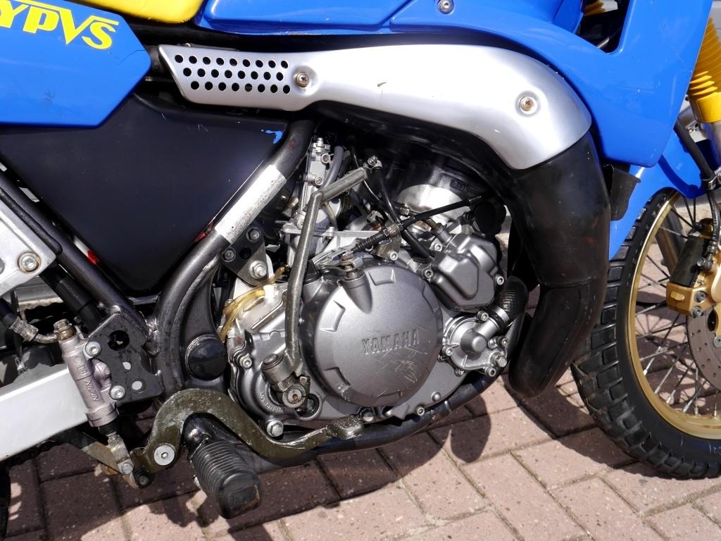 Dat is in principe gelijk aan dat van de TZR. Maar de zaak werd wel aangepast voor offroad gebruik. Zo is de eerste versnelling lekker kort. Het blok is met silentblocks in het frame gemonteerd. Dat houdt de typische tweetakttrillingen effectief weg van het frame en de berijder. Onder de 7.000 tpm is de twin vleugellam. Daarboven knalt het vermogen er in. Zeker als er een set aftermarket expansie uitlaten is gemonteerd. Het eindschot gaat door de 10.000 tpm waarna het vermogen vanaf 10.500 tpm rustig begrensd wordt.