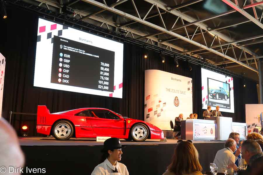 Om 14 u stipt leidde Bonhams dan de Zoute Sale in, in het grote Prado Paviljoen dat op het strand werd neergeplant. De Veiling bracht in totaal 12.000.000 € op. Een zeer zeldzame Bugatti EB 110 SS van 1994 veranderde van eigenaar voor € 2.242.500 incl. premie en een Ferrari F40 voor € 1.840.000.